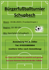 Im Rahmen seines 85-jährigen Geburtstags überraschte die Abteilung Fußball, vertreten durch die beiden Vorstände Christian Völker und Patrick Belz, den Jubilar, Ehrenmitglied und Gönner der Abteilung, Herbert Schmitz, mit einem ganz besonderen Geschenk. Überreicht wurde eine extra angefertigte Bank, inklusive Namensschild, mit Reservierung auf Lebenszeit. Ein Sitzkissen seines Lieblingsvereines „Borussia Dortmund“ wird immer im Vereinsheim… Abteilung Fußball weiht Herbert Schmitz Tribüne ein weiterlesen - Wichtige Information für Kunden der Volksbank SchupbachDurch die Fusion der Volksbank Schupbach mit der Volksbank Mittelhessen ergeben sich für alle Kundinnen und Kunden neue Bankverbindungen. Um eine reibungslosen Abbuchung der Beiträge für den TuS Schupbach zu gewährleisten, bittet der Vorstand darum, die neuen Bankverbindungen unter Angabe des Vor- und Zunamens mitzuteilen. Dies kann wie folgt erfolgen: 1. Postalische Zustellung an die folgende Adresse:… Wichtige Information für Kunden der Volksbank Schupbach weiterlesen